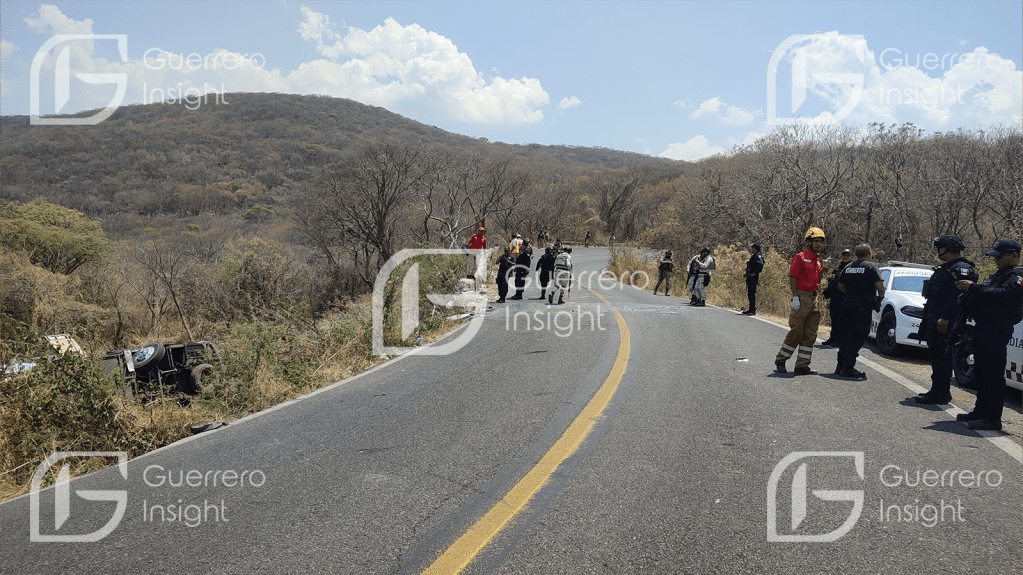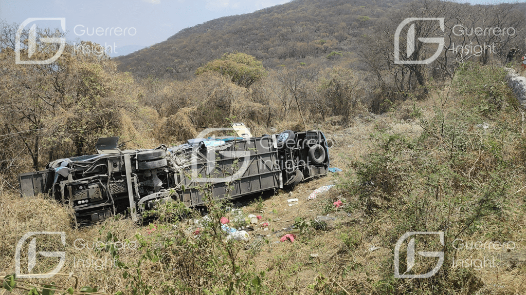 Pilcaya. Gro. 01 de mayo de 2025.- Un autobús en el que viajaba jornaleros, volcó en el municipio de Pilcaya, municipio de la zona Norte, dejando como saldo un muerto y 30 heridos, entre los cuales hay menores de edad.