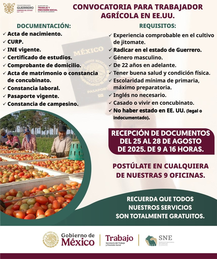 Redacción. El Gobierno de Guerrero, a través del Servicio Nacional de Empleo (SNE), lanzó una convocatoria para trabajadores agrícolas interesados en laborar en Estados Unidos. La campaña destaca por su enfoque inclusivo, utilizando videos en lenguas indígenas como el amuzgo para asegurar que la información llegue a comunidades históricamente marginadas.