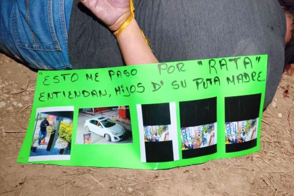 Junto a él, una cartulina con el mensaje «Esto me pasó por rata» fue decomisada por las autoridades. Elementos de los tres órdenes de gobierno acordonaron la zona tras el reporte a las 8:50 de la noche. Peritos de la Fiscalía General del Estado realizaron las diligencias y el cuerpo fue trasladado al Servicio Médico Forense para la necropsia.