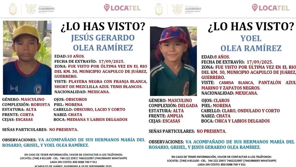 María del Rosario (13), Grisel (12), Jesús Gerardo (10) y Yoel Olea Ramírez (8) fueron vistos por última vez el 17 de septiembre cerca del río en el Kilómetro 30, un poblado marcado por ataques armados y extorsiones recientes. Vestían camisa blanca y pantalón azul (Yoel), blusa blanca con falda verde (las niñas) y playera negra con short de mezclilla (Jesús).