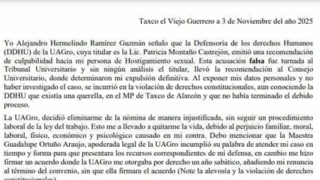 Redacción / Taxco de Alarcón. El profesor Alejandro Hermelindo Ramírez Guzmán, expulsado en julio de la Universidad Autónoma de Guerrero (UAGro) por presunto acoso sexual, se quitó la vida dejando una carta que denuncia irregularidades graves. En ella, detalla cómo la Defensoría de Derechos Humanos de la UAGro emitió una recomendación de culpabilidad sin proceso adecuado, violando sus derechos constitucionales pese a una querella pendiente en Taxco.
