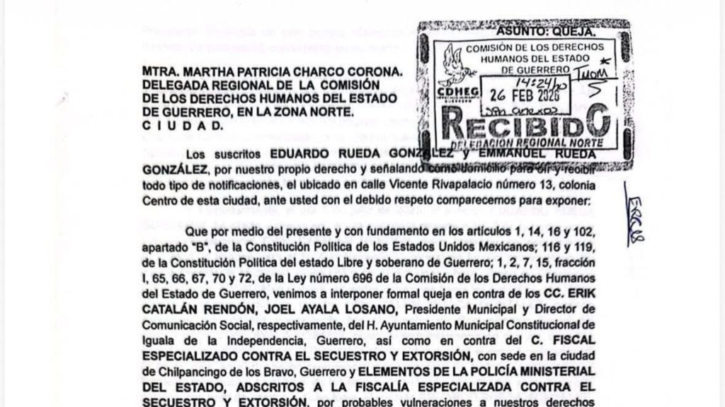 Redacción / Iguala. La Comisión de Derechos Humanos del Estado de Guerrero (CDHEG) inició formalmente una investigación bajo el expediente CDHEG-DRZN/011/2026-I en contra del presidente municipal de Iguala, Erik Catalán Rendón, y del director de Comunicación Social, Joel Ayala.